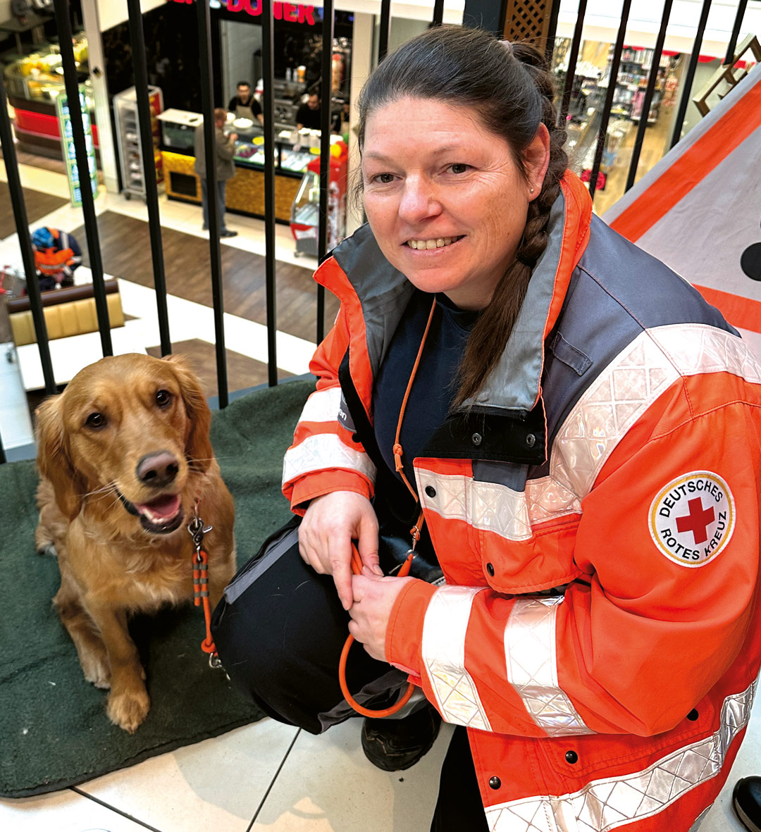 Froh war Frederik Schlichting darüber, dass es so kurzfristig gelungen war, die komplette Blaulichtfamilie zu versammeln. Damit war das Angebot für interessierte Besucher groß: Das DRK zeigte zum Beispiel, wie Drohnen vermisste Personen aufspüren – dazu kreiste das kleine Fluggerät in einem Zelt über einem Spielteppich, auf dem es Lego-Figuren zu orten gab. Von diesem Angebot waren besonders Kinder begeistert, genauso wie von Fine: Die Rettungshündin in Ausbildung war mit Hundeführerin Stefanie Marten von der DRK-Rettungshundestaffel im Center. Krankenkassen, die Polizei, der ASB, THW, Feuerwehr und weitere Partner präsentierten sich.
